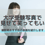 大学受験写真では、口角をあげて微笑む程度の表情がおすすめです。歯を見せて笑ってしまうと本人確認用の写真としてふさわしくないので避けた方が良いです。